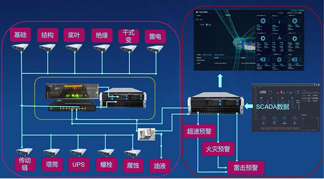 该系统通过对风电机组关键部件加装高性能的机电、超声、光电传感器,并对其数据采集,结合历史数据提取故障特征,利用神经网络等大数据算法,实现风机状态监测、视频监控系统、超速预警、消防预警、风机IP 电话系统、扩展功能等。同时,融合多参数信息,实现机械、电气与视频特征量的监控、预警与诊断,加强机组安全,实现预防性的运营维护和智能化风场。